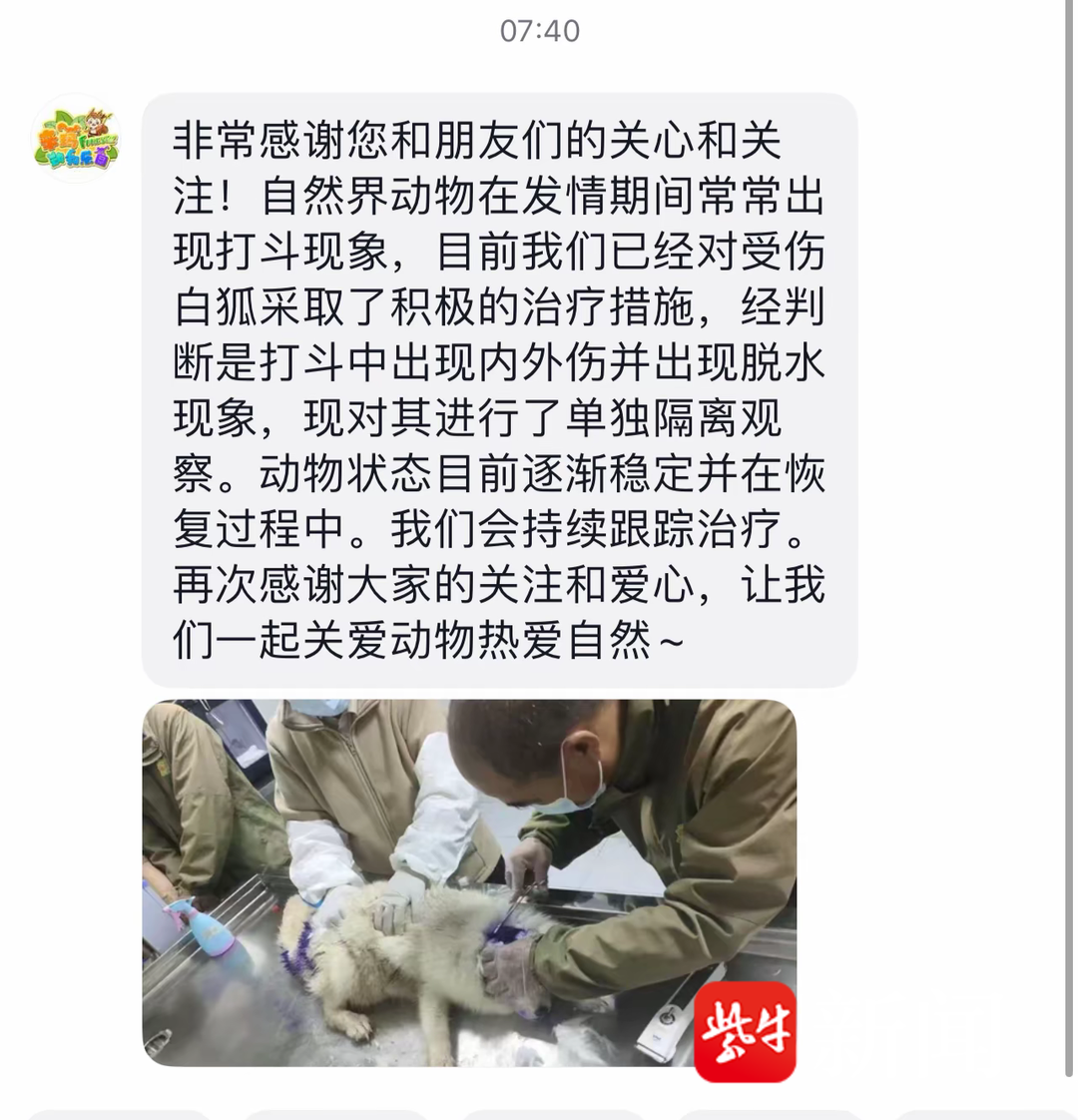 记者了解到,针对网友关心的受伤白狐问题,今天(5月12日)上午,辛玛森林动物园予以了回复。园方称,自然界动物在发情期间常常出现打斗现象,目前已经对受伤的白狐采取了积极的治疗措施,经判断,是打斗过程中出现了内外伤并出现了脱水现象,现对其进行了单独隔离观察,动物状态目前逐渐稳定并在恢复过程中。园方表示,将持续跟踪治疗,感谢网友们的关注和爱心。